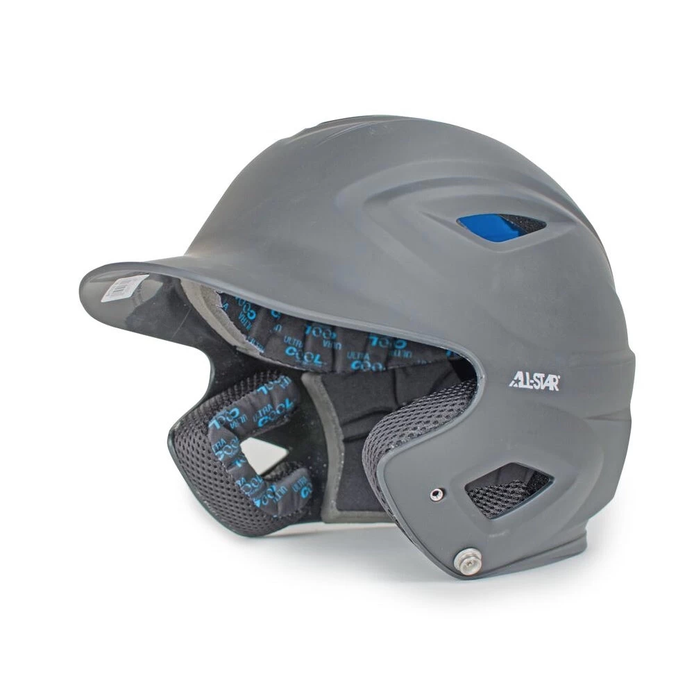 This adult sized All Star System7 BH3500M Matte Baseball Helmet ABS shell is designed for maximum coverage in critical areas. The interior foam lining deploys Ultracool to provide the batter with a constantly cool, sometimes even dry helmet. Next, ventilation achieves more of the same due its strategically placed components for maximum shell strength. Lastly, this All Star System7 lends its face-masks and chin straps for extra convenience.
