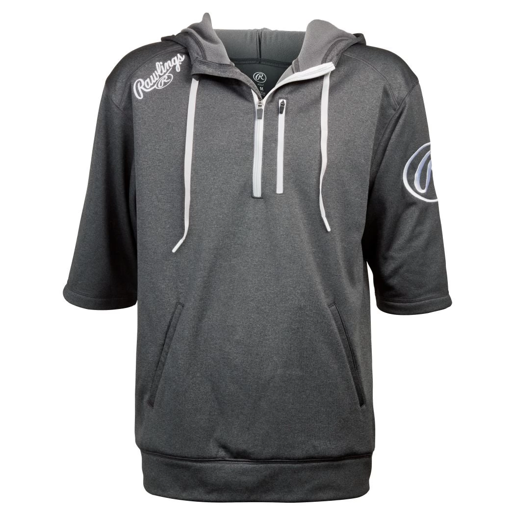 The Rawlings Mens Short Sleeve Hoodie is the perfect pre game, bench, or post-game apparel item for baseball players and coaches. It looks stylish, keeps player s comfortable, and allows for easy upper body movement. This item is an absolute must have for any ball player or coach, and fortunately is available now for a great price tag. This Men s Short Sleeve Hoodie comes in a quarter zip short sleeve hoodie with drawcard design. The quarter zip design allows for controlled airflow which makes this hoodie great for all types of weather conditions. It has a heather combination grey and black (Dark Shadow) coloring, that looks fantastic. The 100 percent Polyester Fleece this item is made out of, makes it one of the most comfortable clothing choices around. There is also a self-fabric bottom hem on this item. Additionally, the hoodie has a Kangaroo front pocket and zipper chest pocket.