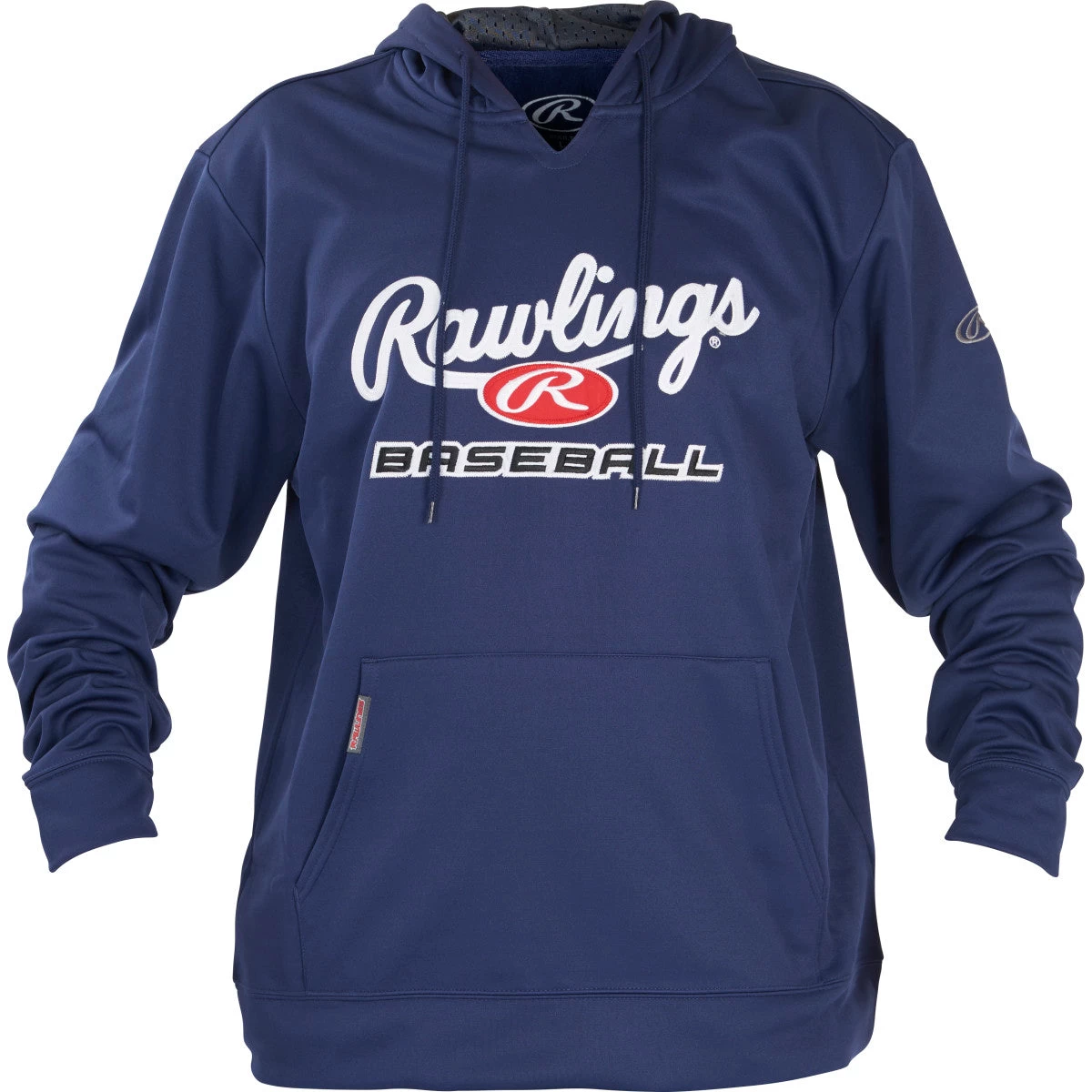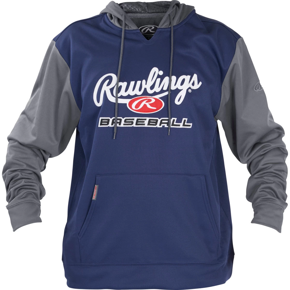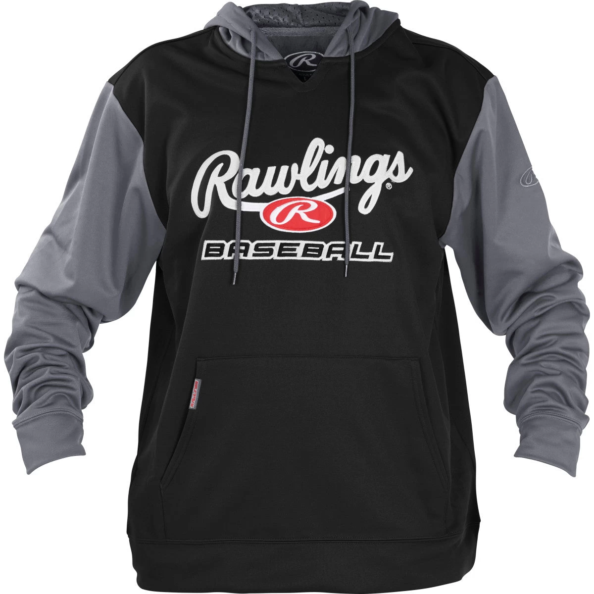This Rawlings PFHPRBB Fleece Hoodie is perfect for the crisp fall nights when you re sitting on the sidelines watching your favorite team play. This 100% Pro Dri Polyester Hoodie features a MP3/phone pocket and internal media eyelet for cord security. The V-cut neckline and self-fabric hem and cuffs make this one of the most comfortable items that Rawlings makes. The Rawlings pro baseball twill design on chest that looks great.